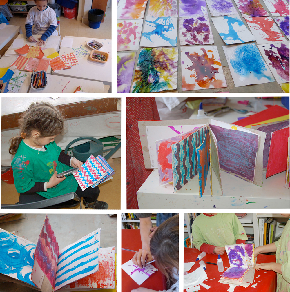 Peindre sur l’eau avec de l’encre, c’est le fameux procédé du marbling, haut en couleur, et sur les multiples supports de papiers et magazines, ce fut atelier très créatif. Atelier avec des jeunes gens.