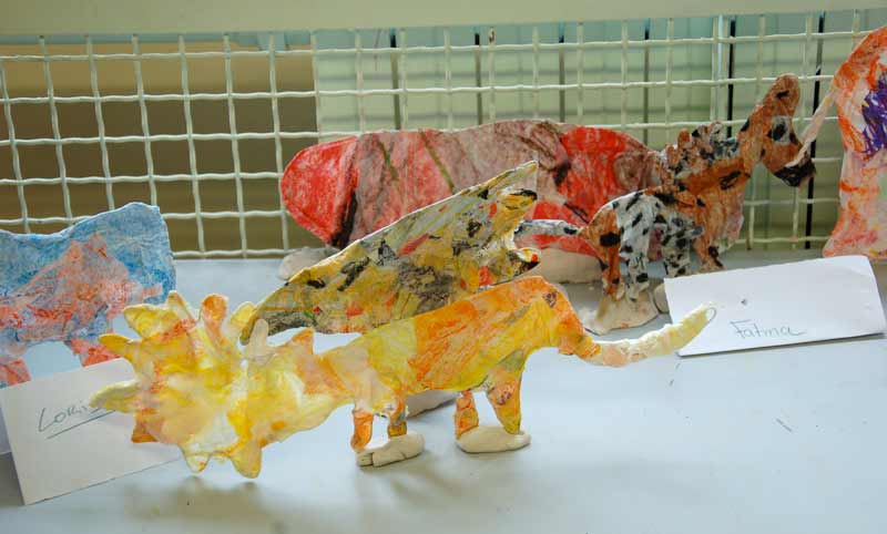 La ménagerie de l’atelier d’art plastique de la classe de Nathalie. Fil électrique, argile, papier de soie et craies, les enfants ont présenté un cirque imaginaire plein de couleur et de poésie. Atelier mené en résonnance sur deux classes, pour l’association GYGO.