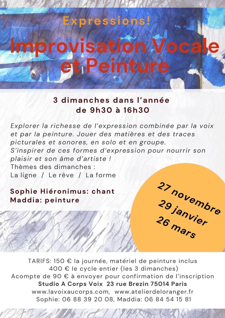 Nous vous proposons trois journées d’expressions artistiques à Paris dans le 14ème, partagées entre les sollicitations d’improvisations vocales de Sophie Hiéronimus et les propositions picturales de Maddia (Geneviève Grenié Gaillard).
